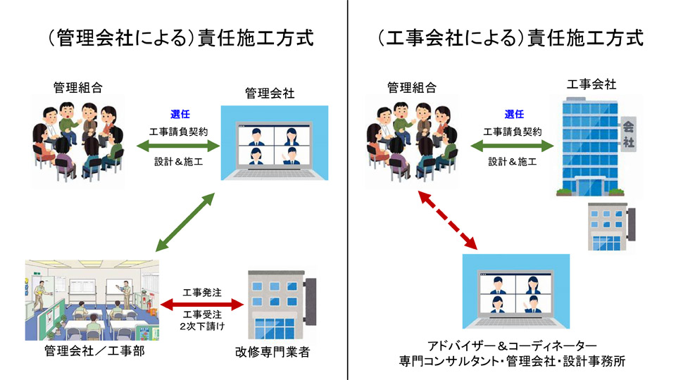 最近、多くなっている大手管理会社による責任施工方式(総合請負契約)では、管理会社の工事部が改修専門業者に二次発注することになります。